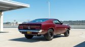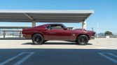 Delivered from the factory in Indian Fire Red (Y), the car is said to have received fresh sheet metal in the quarter panels, as well as replacement front fenders and chrome bumpers, before a repaint in its current Vintage Burgundy Metallic was performed under previous ownership. Features include C-pillar trim, pop-out quarter windows, color-keyed racing mirrors, a functional fiberglass hood scoop, and Boss 429 fender decals. A reproduction Kar Kraft Engineering decal is fitted to the driver’s door above the VIN tag.