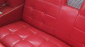 The interior features button-tucked red upholstery with a matching dashboard, door panels, and carpets. Amenities include electric windows, a power-adjustable front bench seat, front and rear lap belts, an analog clock, and a push-button radio. A matching soft top boot cover aLompanies the car and shows a repaired tear. Wear is noted on the carpet, and the seller states the analog clock is currently non functioning and that the passenger-side sun visor frame needs replacement.