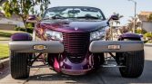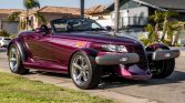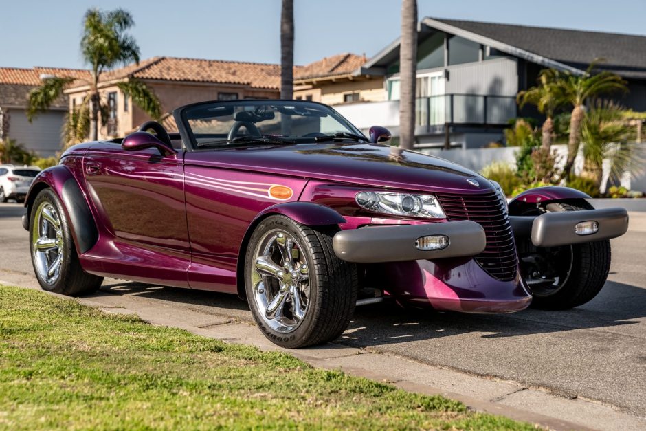 This 1999 Plymouth Prowler is finished in purple over black, and its 3.5-liter V6 is paired with a four-speed automatic transmission. Features include pinstriping, a black soft top, staggered 17″ and 20″ wheels, four-wheel disc brakes, air conditioning, power windows, cruise control, a cassette stereo, and keyless entry.