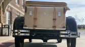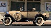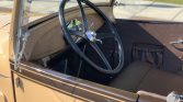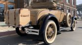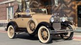 This 1929 Ford Model A is finished in tan and brown over a matching interior and is powered by a 201ci inline-four paired with a three-speed manual transmission. Additional equipment includes a tan convertible top, a rumble seat, a tilt-out windshield with a single wiper, etched glass wind wings, 21″ wire wheels, and a folding luggage rack with a storage trunk.