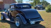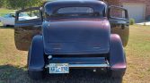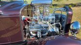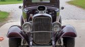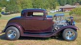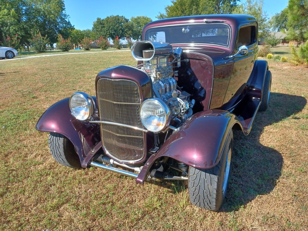 This 1932 Ford three-window coupe is finished in black cherry metallic over tan leather and is powered by a supercharged 355ci V8 mated to a three-speed automatic transmission. The fiberglass-bodied car features a Roots-style supercharger, dual Edelbrock carburetors, an MSD ignition, rack-and-pinion steering, front disc brakes, Cragar wheels, shaved door and trunk-lid handles, air conditioning, power windows, and an overhead console housing a Pioneer digital media receiver.