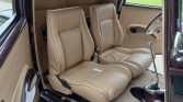 The cabin features tan leather bucket seats along with a matching headliner, door panels, and carpeting. An overhead console houses a Pioneer digital media receiver connected to Pioneer speakers mounted behind the seats. Additional amenities include a Lokar floor shifter, air conditioning, lap belts, and tilt steering. A hinged panel allowing access to the brake master cylinder is located in the driver-side floorboard.