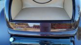 The fiberglass body is finished in black cherry metallic and features chrome spreader bars and chrome headlight buckets with halogen lamps and integrated turn signals. The taillights are flush-fit, and the trunk and rear-hinged doors open with electric poppers.