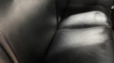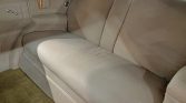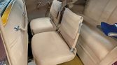 The rear passenger compartment is isolated via a partition featuring a roll-down glass window, and features courtesy lights as well as storage compartments and hanging straps. Tan cloth seating for five includes two folding jump seats ahead of a fixed bench. Gold carpeting lines the floor, and the windows are surrounded by burl wood trim.