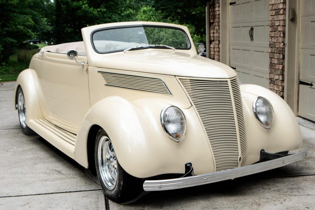 This 1937-style Ford convertible street rod was built using a Gibbon Fiberglass Reproductions body on a custom chassis, and it was acquired by the current owner out of South Dakota in 2018. Finished in white over beige leatherette upholstery with a tan soft top, the car is powered by a 350ci V8 Chevrolet crate engine for which a replacement fuel pump was installed in preparation for the sale. Additional equipment includes a three-speed automatic transmission, an Edelbrock carburetor, air conditioning, a Pioneer CD stereo, and Boyd Coddington wheels as well as power steering, brakes, seats, windows, and locks.