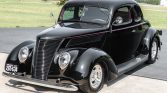 This 1937 Ford coupe was refurbished and modified under previous ownership before it was acquired by the seller in 2017. The car is finished in black over burgundy cloth upholstery, and power comes from a 327ci V8 paired with a three-speed automatic transmission. Features include chrome bumpers, dual taillights, turn signals, front disc brakes, 14″ and 15″ aluminum wheels, power-assisted steering, an Edelbrock intake manifold, dual-exit exhaust, a tilt steering column, VDO instrumentation, and a JVC cassette…