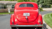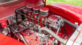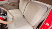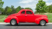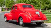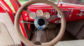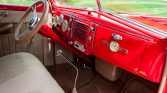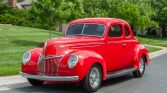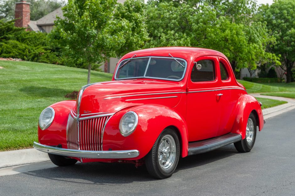 This 1939 Ford Deluxe coupe was refurbished and modified during prior ownership, which included refinishing the bodywork in Torch Red, reupholstering the tan interior, and installation of a 255ci flathead V8 paired to a T5 five-speed manual transmission. Additional modifications include three Stromberg carburetors, Offenhauser aluminum cylinder heads, an Isky camshaft, Fenton exhaust headers, an aluminum radiator, front disc brakes, and 15″ American Racing wheels.