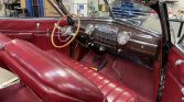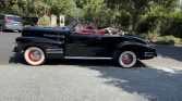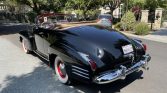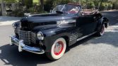 This 1941 Cadillac Series 62 convertible is finished in black over red and powered by a 346ci L-head V8 paired with a four-speed Hydra-Matic automatic transmission. Features include a tan convertible top, red-painted 15″ wheels with chrome hub caps, whitewall tires, chrome bumpers with overriders, and a split front windshield.