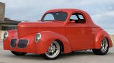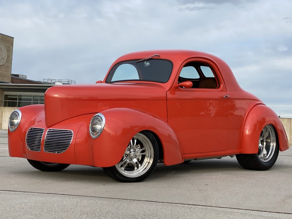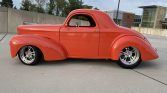 This Willys coupe street rod was built by Fulk’s Rod Shop of Sandyville, West Virginia, utilizing a boxed tube frame and a 1940 Willys Americar-style steel-reinforced fiberglass body. The car is finished in orange over tan leather upholstery and is powered by a 502ci GM V8 paired with a three-speed automatic transmission. Equipment includes Vintage Air air conditioning, VDO instrumentation, a tilting Ididit steering column, a Sony CD stereo, Billet Specialties wheels, and disc brakes.
