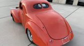 The steel-reinforced fiberglass body said to have been sourced from Antique & Collectible Autos is mounted to a boxed tube frame and has been mini-tubbed at the rear. House of Kolor Tangerine Pearl paint is aLented by polished door handles, lighting surrounds, and 1940 Willys-style front grilles. Additional exterior details include a split-rear window, a retractable antenna, and a single roof-mounted windshield wiper.