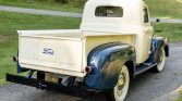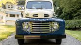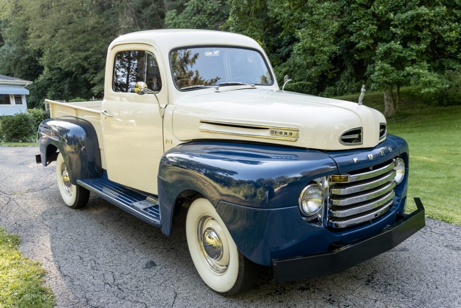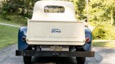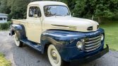 This 1948 Ford F-1 pickup is finished in almond with blue fenders over two-tone brown and is powered by a 226ci flathead straight-six paired with a three-speed manual gearbox. The truck was purchased by the seller in 2017 and subsequently refurbished with work including a body-off repaint, retrimming the interior, rebuilding the engine, and installing front disc brakes. Features include 16″ white painted steel wheels with chrome covers, a wooden bed floor, chrome exterior trim, running boards,…
