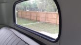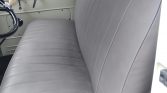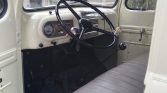 The cab features a custom gray leather bench seat, body-color sheet metal, rubber floor mats, and a gray headliner with an aftermarket dome light. Directionals have been equipped and additional interior features include manual side windows, pop-out vent windows, and a single-speed windshield wiper.