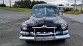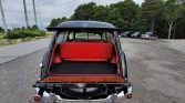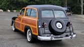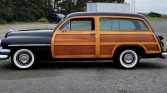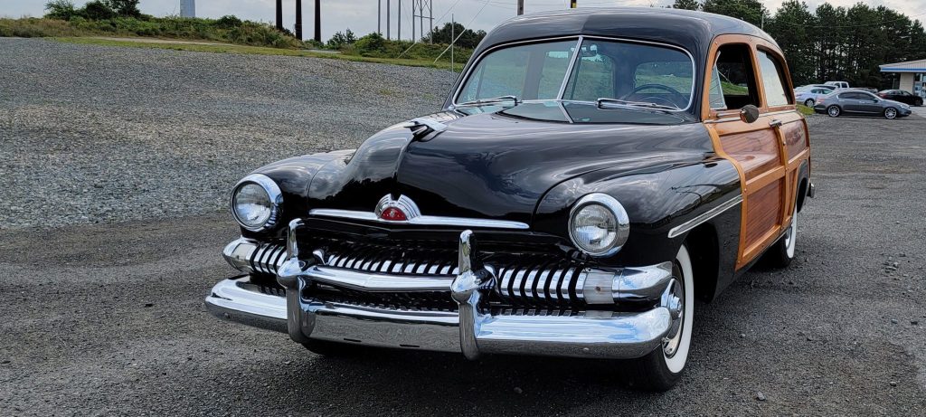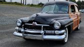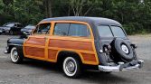 This 1951 Mercury woodie wagon is finished in black with wood paneling over red leather and is powered by a 255ci flathead V8 paired with a column-shifted three-speed manual transmission. Equipment includes a 12-volt electrical system, 15” wheels, an AM radio with auxiliary input, and dual exhaust outlets.