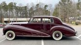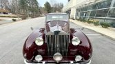 This 1951 Rolls-Royce Silver Wraith features sedan coachwork by James Young and is finished in dark red over beige leather. Power is supplied by a 4.6-liter F-head inline-six paired with a four-speed manual transmission, and features include a push-button radio, a front driving light and fog lamps, whitewall tires, and a chrome grill, trim, and bumpers.