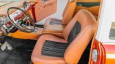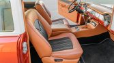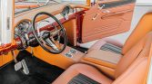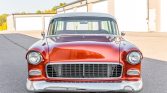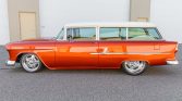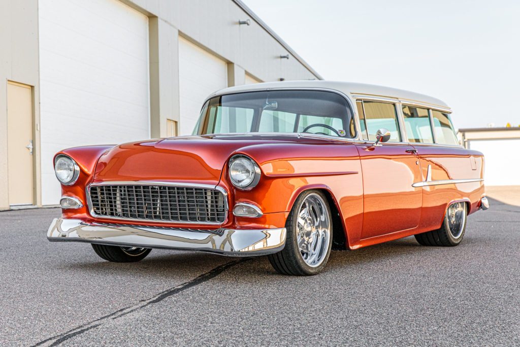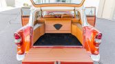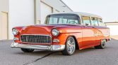 This 1955 Chevrolet 210 Handyman wagon is finished in metallic orange and white over an orange and black interior and powered by a 502ci V8 paired with a Turbo 400 three-speed automatic transmission. Features include a custom chassis by Scott’s Hot Rods, smoothed and wire-tucked engine bay, custom leather interior by Armando’s Auto Upholstery, adjustable coilovers at all four corners, Wilwood power-assisted four-wheel disc brakes, power steering, Budnik Muroc II wheels, a four-link rear suspension with a narrowed 9″ rear axle, Borla Pro XS mufflers, and a Kenwood CD/USB stereo.