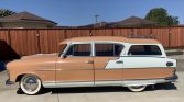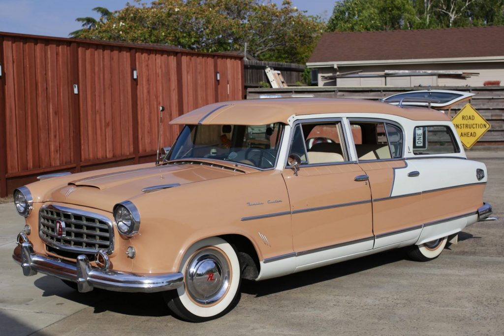 This 1955 Hudson Rambler Custom Cross Country station wagon was purchased by the seller’s late husband in 1996 and was used to tow a vintage RV. The wagon is finished in peach with white accents over a matching interior and is powered by a 3.8-liter V6 paired with a three-speed automatic transmission. Features include a roof rack, chrome bumpers, fender skirts, a windshield visor, a receiver hitch, and a cassette stereo.