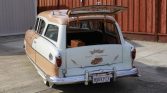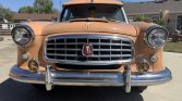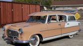 The Hudson Motor Car Company and Nash-Kelvinator merged in 1954 and became the American Motors Corporation. While the Rambler was initially a part of the Nash lineup, after the merger Ramblers were badged as both Nashes and Hudsons. This Hudson Rambler wagon is finished in peach with white accents and features chrome bumpers and trim, a bumper-mounted backup light, front driving lights, rear mudguards, a roof rack, fender skirts, a windshield visor, pinstripe accents, and a caricature of the wagon on the tailgate. A receiver hitch has been installed and is hidden behind a flip-up license plate holder when not in use.