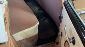 The cabin is upholstered in peach and features white vinyl accents, black carpets, and multi-color pinstriping on the metal dashboard. Features include pop-out vent windows, a compass, and an aftermarket cassette stereo.