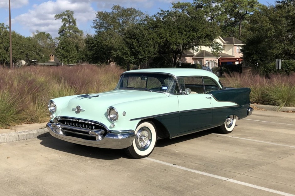 This 1955 Oldsmobile 88 is finished in light green and dark green over a matching interior and is powered by 324ci “Rocket V8” paired with a four-speed Jetaway Hydra-Matic automatic transmission. Equipment includes 15″ steel wheels with covers, whitewall tires, power steering, power brakes, a heater, front lap belts, and a Deluxe push-button AM radio. The car is said to have been acquired by the seller in 2017 and subsequent work consisted of rebuilding the carburetor and radiator and cleaning the fuel tank and fuel line.