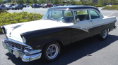 This 1956 Ford Fairlane Club Sedan is finished in black and white over a two-tone gray interior, and it is powered by an overbored 292ci V8 mated to a Borg-Warner five-speed manual transmission and a 3.25:1-geared rear axle. Modifications include American Racing Torq Thrust wheels, power brakes, power steering, a Hurst shifter, reupholstered front and rear bench seats, a Pioneer CD stereo with Clarion speakers, AutoMeter and Sunpro gauges, and a leather-wrapped Ididit steering wheel. The seller…