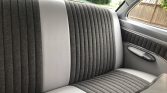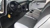 Originally trimmed in two-tone gray cloth, the cabin was reupholstered in its current shades of gray vinyl with darker gray inserts in 2015. Equipment includes front and rear bench seats with lap belts, a body-color dashboard, a heater, a push-button AM radio, an aftermarket Pioneer CD stereo, Clarion speakers, and a Hurst shifter with a white knob.