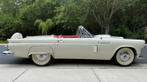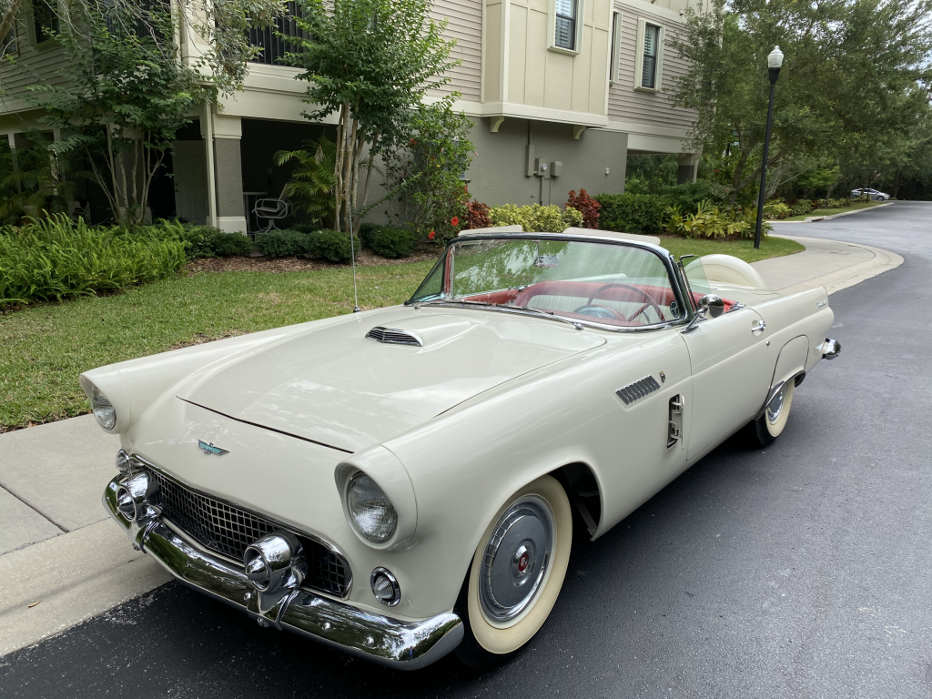 This 1956 Ford Thunderbird was delivered new to J.W. Burch and Son of La Habra, California and spent time in Michigan before being acquired by the seller in Florida in 2018. The car is finished in white over a red and white interior and powered by a 292ci V8 paired with a three-speed manual transmission. Equipment includes a red soft top, rear fender skirts, an AM radio, and dual exhaust. A refurbishment was reportedly completed under prior ownership, while work carried out during current ownership consisted of rebuilding the rear axle and replacing the U-joints and soft top.