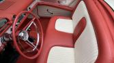 The interior features a bench seat upholstered in red and white vinyl along with matching door panels, a red dashboard top, and engine-turned metal dash trim. Equipment includes a manually-adjustable bench seat, crank windows, a push-button AM radio, and a locking glovebox.
