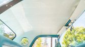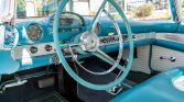 The cabin features a bench seat trimmed in Peacock Blue and white vinyl along with matching door panels and black carpets. Equipment includes engine-turned trim, a floor-mounted shifter, roll-up windows, wind wings, a Motorola Town and Country AM radio, and a heater.