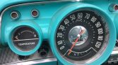 The cabin features a turquoise dashboard and carpets, and the bench seats and door panels are upholstered in turquoise and ivory vinyl. Equipment includes a heater, tissue dispenser, AM radio, and lap belts.