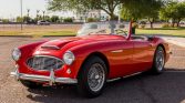 This 1958 Austin-Healey 100-6 is a four-seat BN4 roadster that was acquired by the seller in 1984 and subsequently refurbished between 2001 and 2004. The car is finished in red over black vinyl and is powered by a 2.6-liter inline-six paired with a four-speed manual gearbox with overdrive. Equipment includes a black soft top, tonneau cover, luggage rack, chrome bumpers, and wire wheels. Service in preparation for sale consisted of replacing seals, freeze plugs, and the thermostat…