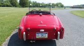 This 1958 Triumph TR3A was purchased by its previous owner in Pennsylvania in 2017 and was acquired by the seller in 2021. The car is finished in red over black upholstery, and power comes from a 2.0-liter inline-four paired with a four-speed manual transmission. Features include a chrome front bumper, rear bumperettes, a folding top frame, an electric fuel pump, and a battery trickle charger.