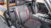 The cabin features custom gray and red upholstery with matching painted surfaces. Interior equipment includes chrome and machined components as well as a custom center console with power mirror, lock, and window switches, air conditioning, a Dual USB/MP3 and CD stereo, and Dual cabin speakers in molded kick-panel enclosures. Storage compartments are mounted behind the rear seats.