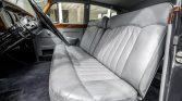 The cabin features seats trimmed in gray leather with matching door panels. The headliner and carpets are said to have been recently replaced, and amenities include a push-button radio, a locking glovebox, central armrests, electric windows, and tray tables for rear-seat passengers. The seller reports that the leather has been re-dyed in areas and the woodgrain trim has been refinished.
