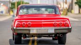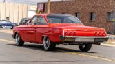 …This 1962 Chevrolet Impala sport coupe was refurbished and modified during prior ownership, which reportedly included refinishing the frame, repainting the bodywork in Torch Red, reupholstering the interior, and installation of a 496ci V8 paired to a Muncie four-speed manual transmission. Additional modifications include a ‘bubble top’-style greenhouse, an Edelbrock cross-ram intake, dual Holley carburetors, aluminum cylinder heads, a Comp Cams roller camshaft, tubular headers, an aluminum radiator, four-wheel disc brakes, lowered suspension, and 20″ wheels.