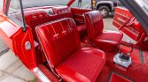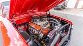 A red monochromatic treatment is carried throughout the interior, including the dashboard as well as the replacement vinyl seat coverings and door panels. The car features a floor-mounted Hurst shifter, an Ididit tilting steering column, and a Bluetooth-capable stereo mounted within the stock opening.