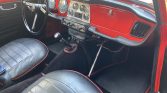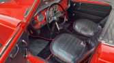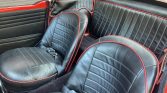 The cockpit features bucket seats trimmed in black leather with red piping, as well as matching door panels and carpeting. Additional features include a heater, carpeted rear parcel shelf, locking glove box, passenger grab handle, and lap belts.