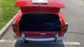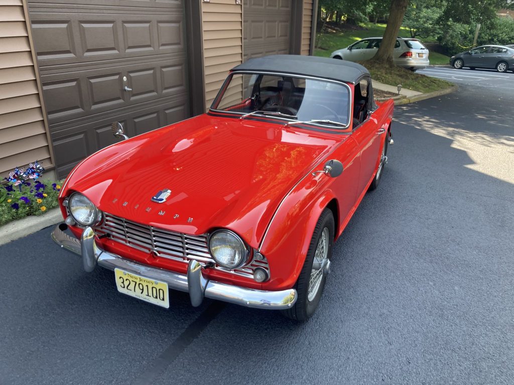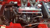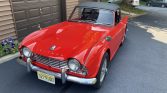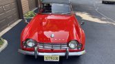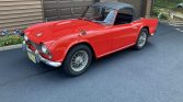 This 1962 Triumph TR4 is finished in red over black leather and is powered by a 2,138cc inline-four paired with a four-speed manual transmission with overdrive. Equipment includes a black soft top, banjo-style steering wheel, dual Weber 45 DCOE carburetors, 15″ wire wheels, and fender-mounted chrome mirrors. The current owner acquired the car in 2015, and subsequent work reportedly involved overhauling the gearbox and replacement of the starter, tires, and clutch.