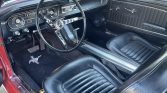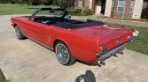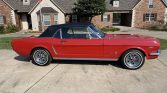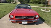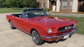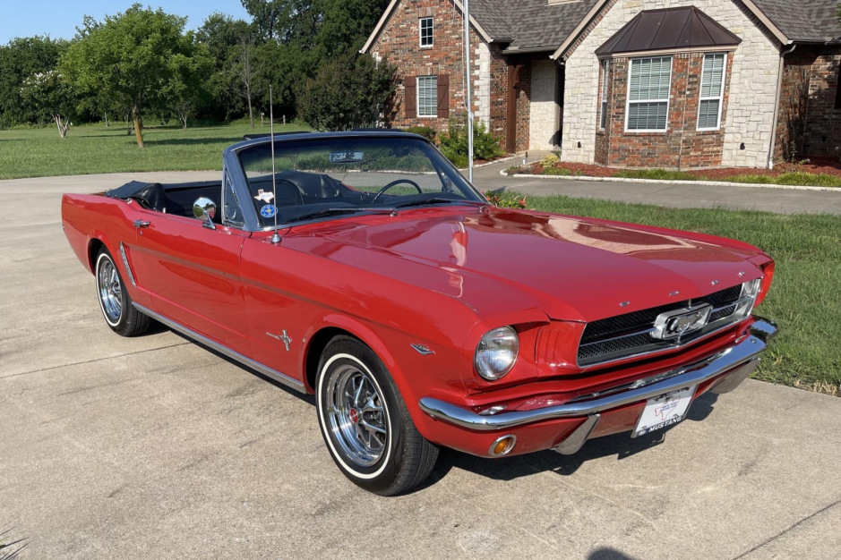 This 1964.5 Ford Mustang convertible is finished in red over black vinyl and is powered by a 260ci V8 paired with a three-speed automatic transmission. Equipment includes 14″ polished wheels, a black power-operated soft top, power-assisted four-wheel drum brakes, power steering, bucket seats, electronic ignition, and an AM/FM cassette stereo. The car was acquired by the current owner in 2002 and is said to have been subsequently refurbished.