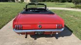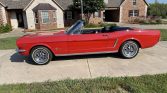 The car was reportedly refinished in red under current ownership and features a black powered soft top with a matching boot cover. Other exterior details include dual rearview mirrors, rocker panel trim, Mustang badging, chrome bumpers, and dual exhaust outlets.