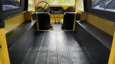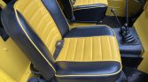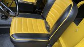 The interior is finished in body color with a textured black floor coating and features a pair of bucket seats upholstered in black and yellow vinyl to match. Amenities include a lockable glovebox, crank windows, and period aLessory turn signal switch.