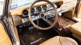 The wood-rimmed steering wheel is mounted on a tilt column and frames Classic Instruments gauges. The 2,300 miles displayed on the odometer represents the distance driven since completion.