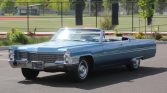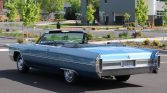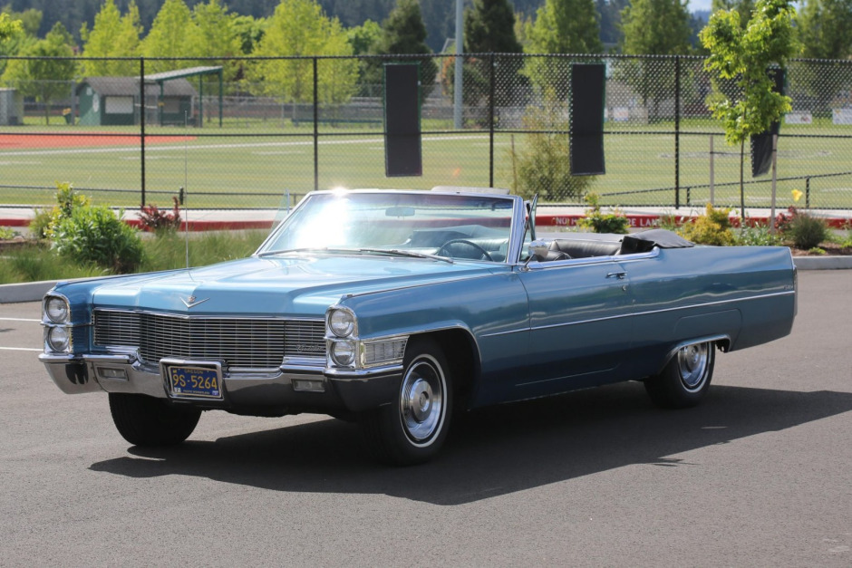 This 1965 Cadillac DeVille convertible was first delivered to Barnard Motors in Portland, Oregon, and is finished in metallic blue over blue leather upholstery. The car is powered by a 429ci V8 paired with a three-speed automatic transmission and is equipped with a power-operated soft top, a six-way power-adjustable front seat, a tilt and telescoping steering wheel, power windows, and an aftermarket AM/FM radio with auxiliary input.