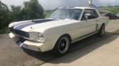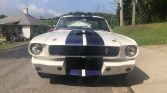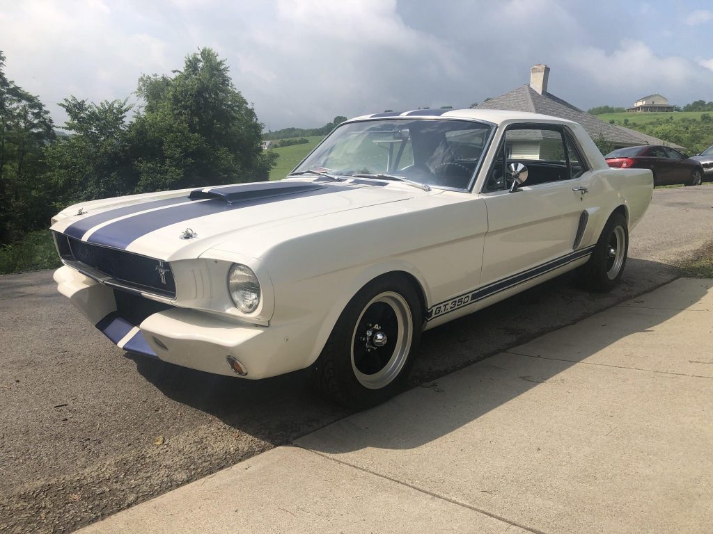 This 1965 Ford Mustang coupe was built in the style of a Shelby GT350 and was subsequently acquired by the seller in May 2021. The car is finished in white with blue stripes over a black vinyl interior and powered by a 302ci V8 paired with a four-speed manual transmission. Equipment includes GT350-style bodywork, a dual exhaust system, front disc brakes, a chrome Monte Carlo bar, 15″ American Racing wheels, and an aftermarket stereo system.