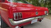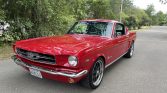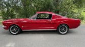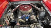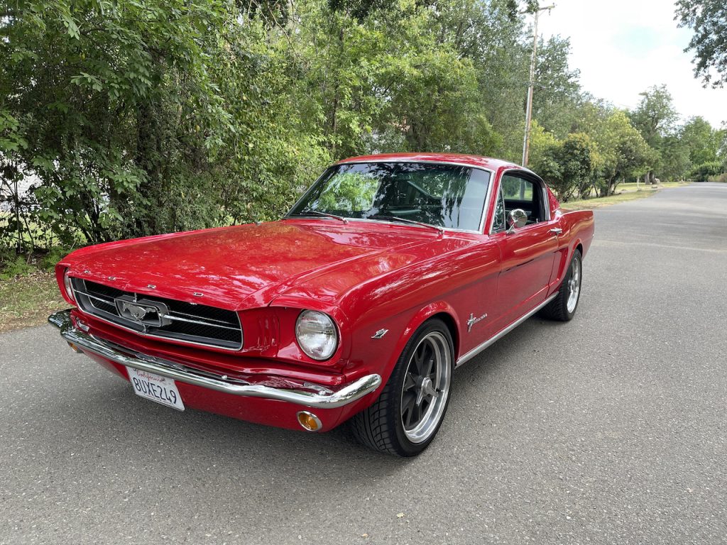This 1965 Ford Mustang fastback is powered by a 289ci V8 paired with a three-speed automatic transmission and is finished in red over black vinyl. Features include 17″ alloy wheels, front and rear disc brakes, Ford Racing valve covers, KYB rear shocks, and an AM radio. The car was refurbished under the previous ownership.