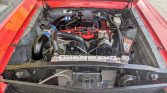 The car has been refinished in red with a black taillight panel, and the bumpers, bumper guards, badges, and trim are said to have been powder coated in black.