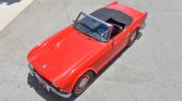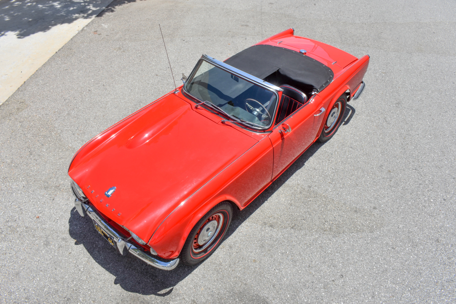 This 1965 Triumph TR4 was built on January 1, 1965, and was acquired by the current owner in 2018. The car is finished in red with a black soft top over black upholstery, and power comes from a 2.1-liter inline-four paired with a four-speed manual transmission. Equipment includes LED headlights, PerTronix electronic ignition, a center console, an Alpine CD player, a Viper alarm system, and a burl wood dash panel. An April 2021 service included the installation of replacement spark plugs and an oil change as well as adjustments of the carburetor and ignition and fuel systems.