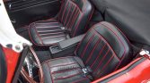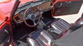 The cabin features sound insulation that was installed before replacement carpets were added in February 2019. The low-back bucket seats are trimmed in black with red piping, and equipment includes Triumph-branded lap belts, a center console, an Alpine CD player, a Viper alarm system, a burl wood dash panel, and Triumph-branded floor mats. The seatback foam is said to be thin.