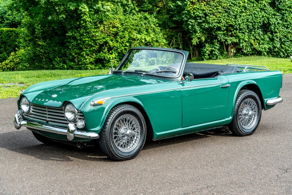 This 1965 Triumph TR4A was acquired as a project by the seller in 1995 and subsequently underwent a body-off refurbishment the following year. Work included a repaint, repairs to the frame and body, and refreshment of the electrical system, suspension, and brakes. Finished in green over black leather, the car is powered by a numbers-matching 2,138cc inline-four linked with a four-speed manual transmission. Equipment includes a black soft top, luggage rack, chrome knock-off wire wheels, a Moto-Lita steering wheel, and a Custom Autosound stereo.