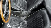 The bucket seats have been reupholstered in black leather with white piping and the cabin features matching door panels and carpets. Additional equipment includes a wood shift knob, a heater, a carpeted rear parcel shelf, locking glove box, lap belts, and a Custom Autosound AM/FM stereo.