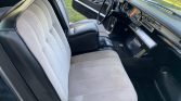 The cabin is trimmed in black with light gray cloth surfaces on the front and rear bench seats. Features include automatic climate control, a power-adjustable front seat, power accessories, folding front and rear armrests, rubber floor mats, a factory radio, and an aftermarket trunk-mounted CD changer.